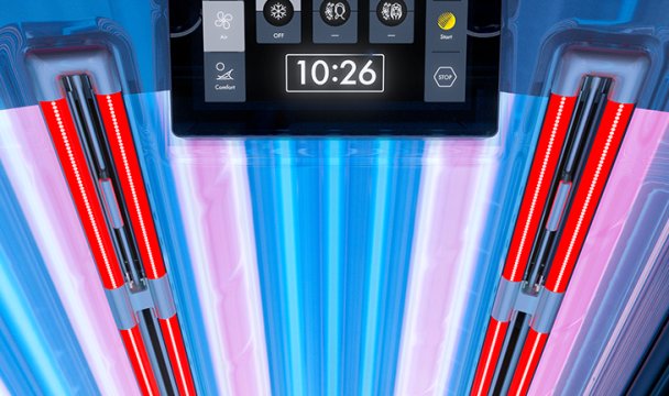 With the success of the P9S, LED technology established itself in the solarium sector. This quantum leap in terms of spectral technology is now available in the K6S and K7S. High-performance LEDs only produce the wavelengths required for a beautiful and gentle tan. At the same time, aspherical lenses in front of the LEDs guarantee an absolutely uniform illumination of the face and décolleté. Progress that can be experienced immediately.
