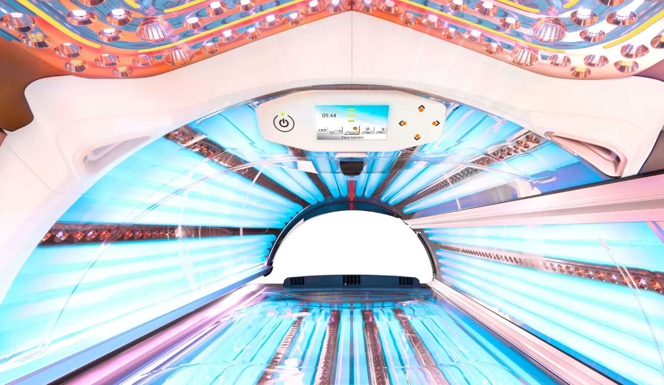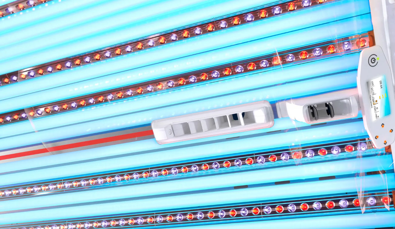 The Jewel is equipped with unique tanning boosters with a high direct pigmentation value. The 10 boosters are evenly distributed across the canopy and bed, and each consist of 25 UV-A PowerLEDs and 25 red LEDs.